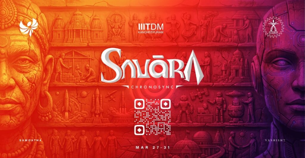Savara 2026 is the flagship techno-cultural fest of IIITDM Kancheepuram, built around the theme ChronoSync, a celebration of the fusion between past and future where tradition meets innovation. Featuring technical events, hackathons, robotics, pro-shows, and cultural performances, Savara creates a dynamic platform for creativity, technology, and talent, uniting thousands of participants in an electrifying experience. Step into a realm where innovation dances with tradition and every moment sparks inspiration as Savara 2026 becomes a journey through time, creativity, and possibilities.
