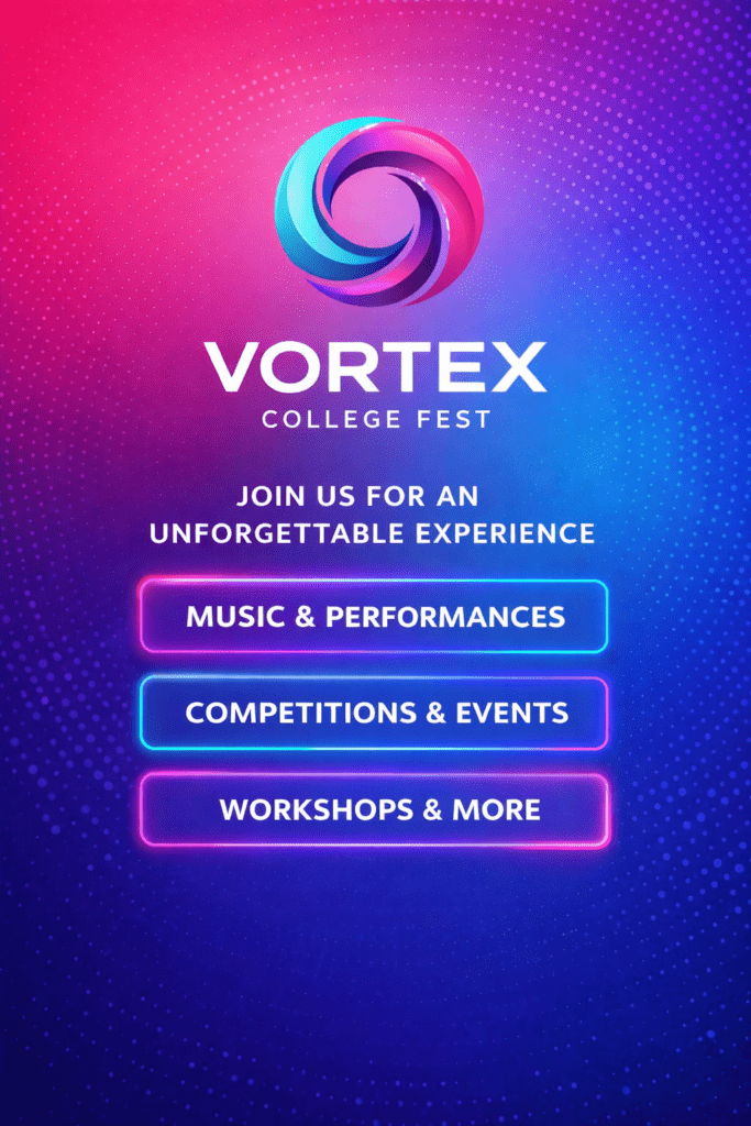 VORTEX is a high-energy college fest that brings together music, performances, competitions, and interactive workshops into one unforgettable experience. Designed to celebrate creativity, talent, and student spirit, VORTEX creates a vibrant platform where students connect, compete, and showcase their skills in a dynamic and electrifying atmosphere.
