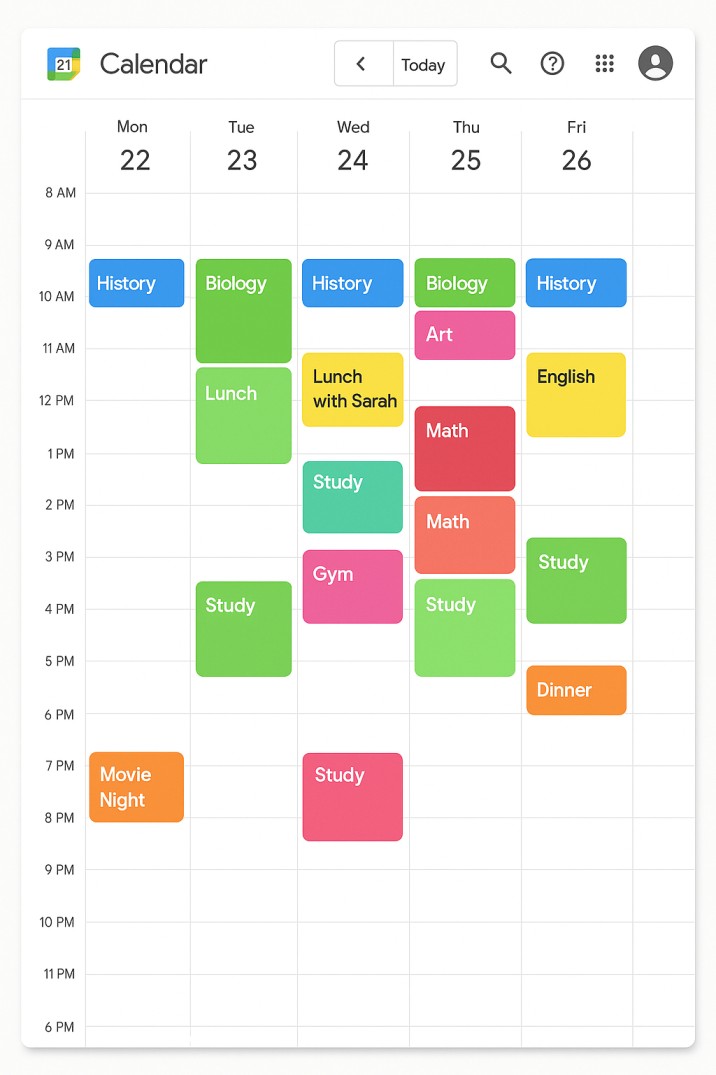 Use the time-blocking method. Students can create recurring events like “Math Practice 5–6 PM” or “Essay Writing 3–4 PM.” Treat these blocks as non-negotiable. Over time, this habit improves productivity and keeps student scheduling steady.