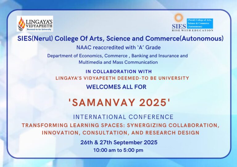 SAMANVAY 2025, an International Conference jointly organised by SIES (Nerul) College of Arts, Science, and Commerce (Autonomous) and Lingaya’s Vidyapeeth (Deemed to be University), was held on September 26–27, 2025, under the theme “Transforming Learning: Synergising Collaboration, Innovation, Consultation, and Research Design.” The two-day conference provided a platform for academicians, industry experts, researchers, and students to engage in meaningful dialogue that bridged the gap between education and industry while fostering innovation and multidisciplinary learning. With keynote addresses, research paper presentations, and interactive sessions, the conference highlighted the necessity of aligning higher education with the rapidly evolving global landscape..