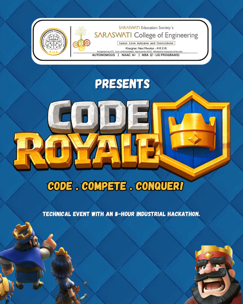 I am Soham, Event Head for Code Royale 2026, a 2-day technical event organized by the AIML Department at Saraswati College of Engineering on 27th and 28th March. The event features an Inter-Department Pitching Competition, Tech Games, Food Fest, Sponsor Showcase, and an 8-hour Inter-College Hackathon.